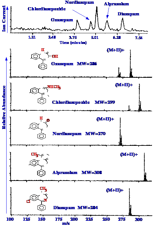 The top chromatogram is the total ion current chromatogram with background subtracted. All the benzodiazepines were well separated and the analysis was complete in less than seven minutes. The positive ion mass spectra obtained for each component are shown below.