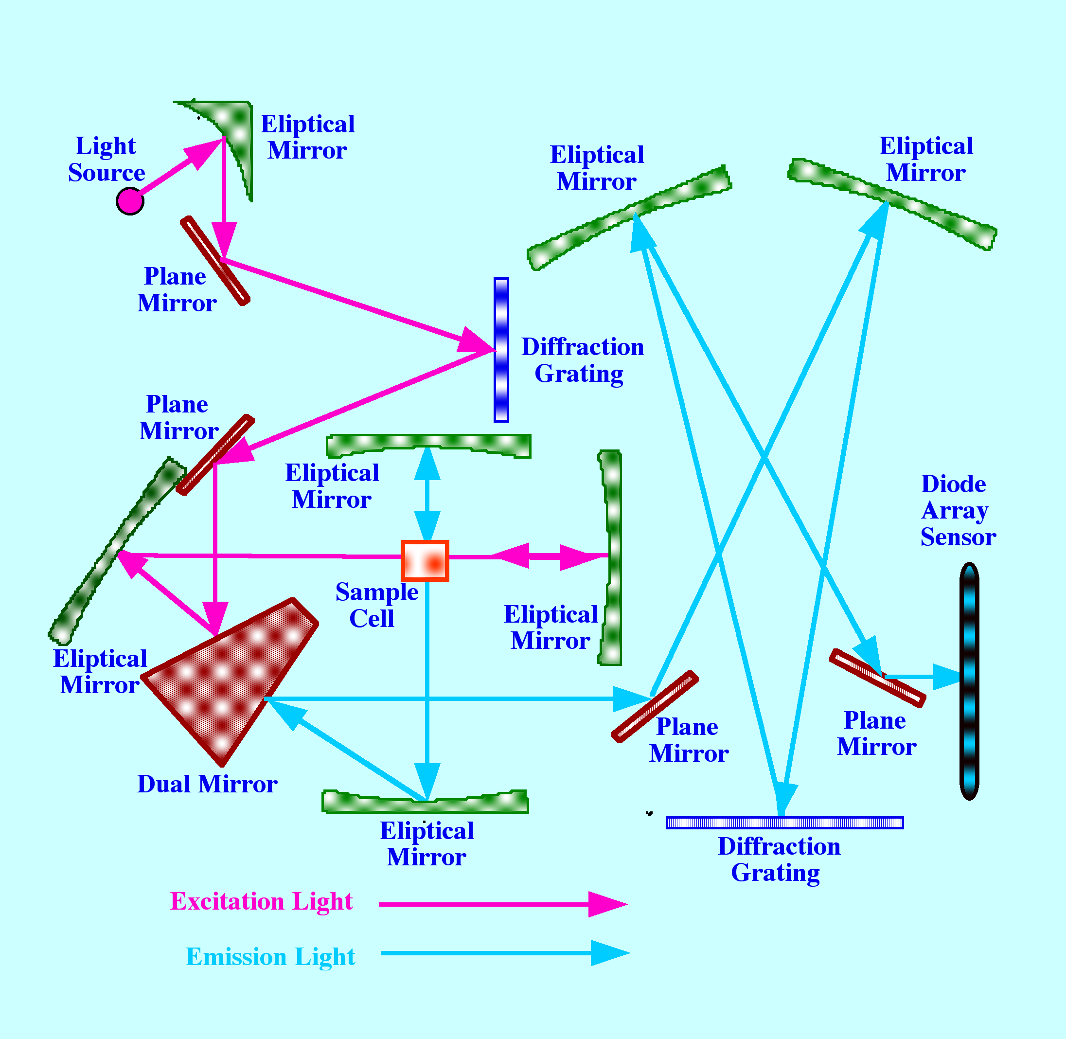There are a large number of instrument manufacturers that provide spectrofluorometers All are basically similar and usually contain two monochromators one for selecting the wavelength of the excitation light and one for the resolution of the fluorescent light. They are widely employed in analytical chemistry as they provide very high sensitivity and, although the number of naturally fluorescent substances is limited, with the use of suitable fluorescent reagents many others can be made fluorescent. The layout of a typical commercially available spectrofluorometer is shown in figure 10. The diagram is a little complicated so to make the system more self explanatory the excitation light is represented by vermillion arrows and the fluorescent light by turquoise arrows.
