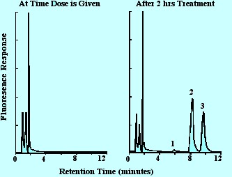 The recoveries of the drug and metabolite ranged from 97.4% to 105.5%. The lower limit of detection for the drug (Flurbiprofen) was approximately 1 x 10-6 g/ml, with a linear dynamic range extending to 50 x 10-6 g/ml. The linear range is small, but no less than would be expected for Fluorescence measurements.