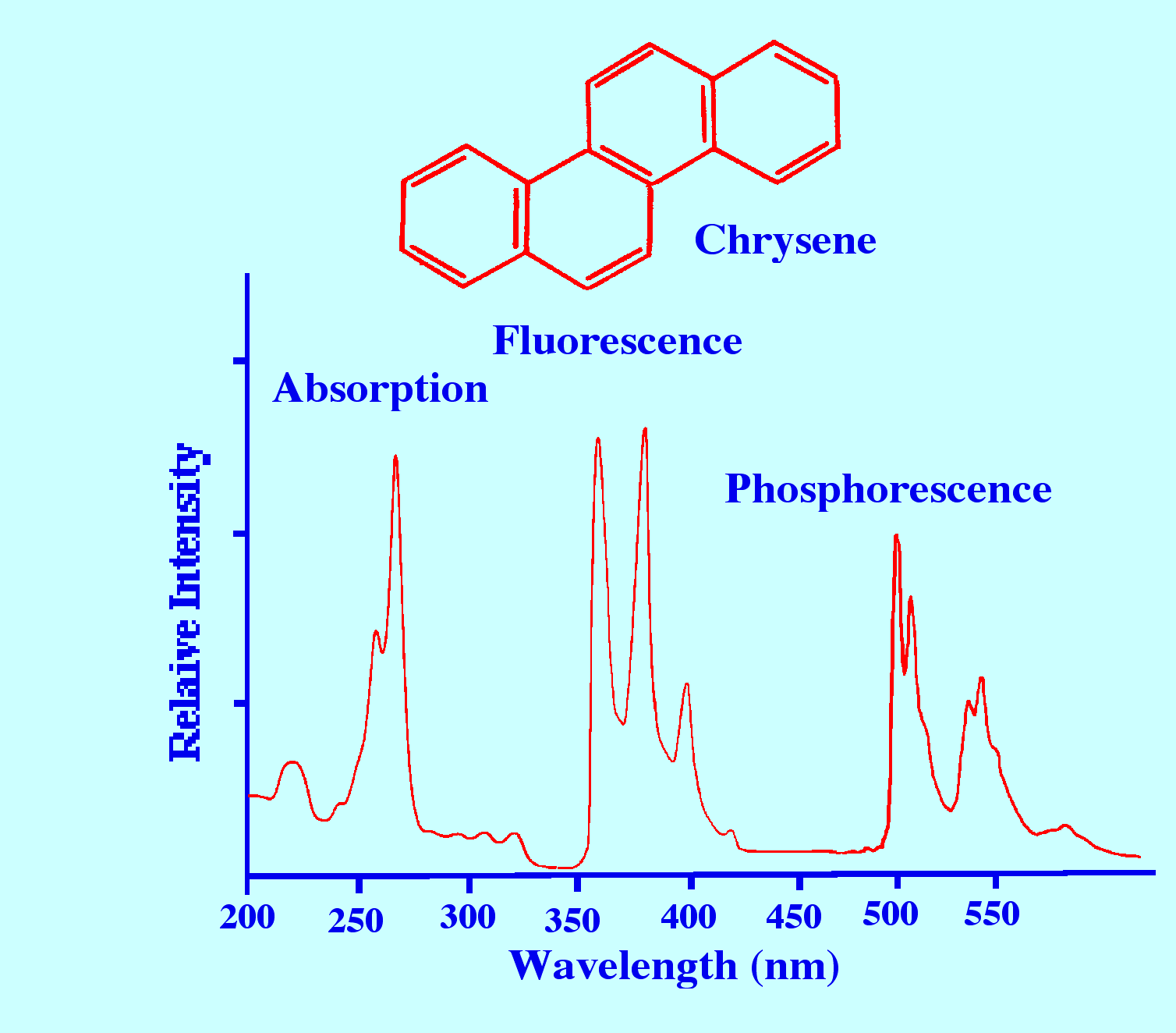 The transition of an electron from an excited singlet state to a ground state occurs readily (usually within 10-9-10-6 sec) with emission of a photon of light and this, as already defined, is called Fluorescence. However, the transition of an electron from a triplet state to a ground state is much more difficult and may take a much longer time (ca 10-4-102sec). Thus, light may be emitted long after the excitation light has been removed. This persistent emission of light is called Phosphorescence. The relative position of the adsorption, Fluorescence and Phosphorescence bands for Chrysene are shown in figure 3. A molecule in a triple state has a lower energy than it would have in its singlet state, thus when returning to its ground state there is a lower energy change and light is emitted at a lower energy (longer wavelength) than it would from the singlet state.