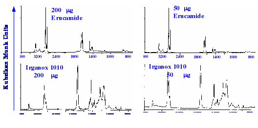 The chloroform was allowed to evaporate at room temperature, and after about an hour, the pellets were removed for IR examination. An example of the spectra taken of some samples provided by the plastics industry is shown in figure 22. It is seen that good spectra were obtained, but the process was tedious, and considering the extraction and concentration processes that were involved, the overall methodology does not appear to have provided a very good sensitivity.