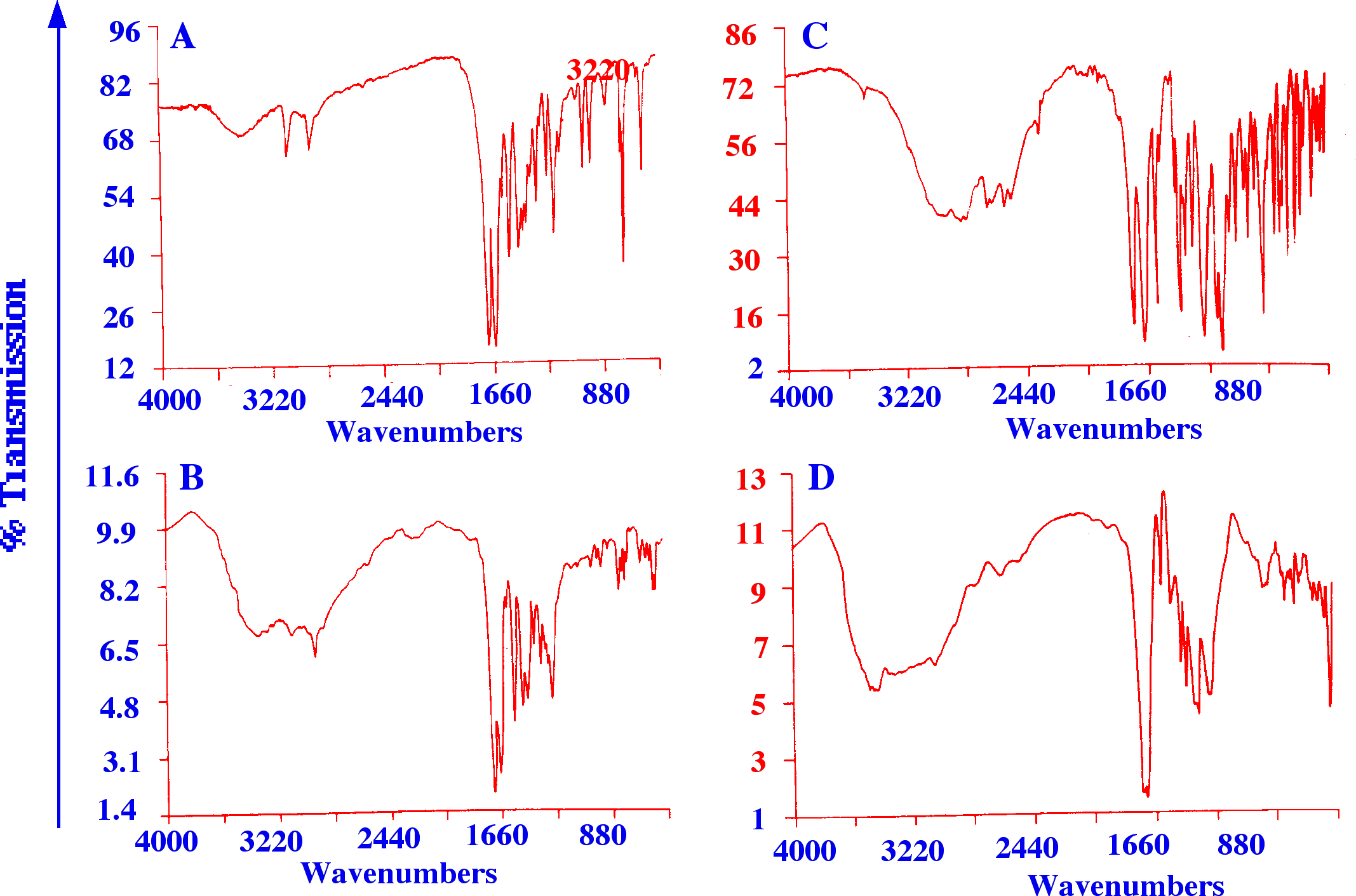 A and C, Spectra from KBr pellets of caffeine and aspirin respectively. B and D, Reflectance spectra from TLC plates of caffeine and aspirin respectively.