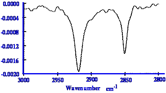 Other accessories available are the photo acoustic detector, The FT-IR microscope, the low volume light pipe GC/IR interface and the Near-TR-FT Raman. An example of a high sensitivity application where the Spectrum of a monolayer of cadmium arachidate adsorbed on the surface of silica is obtained by reflectance is shown in figure 29.