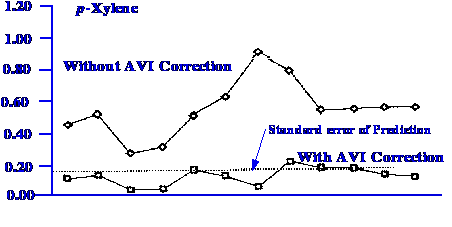 Although most IR spectrometers employ a reference laser, the wave number calibration and the line shape is affected by differences in beam divergence and uniformity. In addition differences can occur between instruments when using different sampling techniques and accessories. The Perkin Elmer instrument has a patented Absolute Virtual Instrument (AVI) protocol that improves measurement consistency by standardizing data against small variations in band position and line shape. An example of its use is given in figure 28, which shows the use of AVI to lower the standard error of prediction (SEP) for xylene concentration in the quantitative analysis of liquid mixtures.