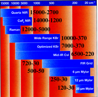 The properties of Beam Splitters and detectors are shown in figure 26. Most modern IR instruments have a range of programs to process the IR data collected, a number of which are used to improve sensitivity, resolution and repeatability. The effect of an algorithm that removes the effect of atmospheric absorption from the spectra in real time is shown in figure 27.
