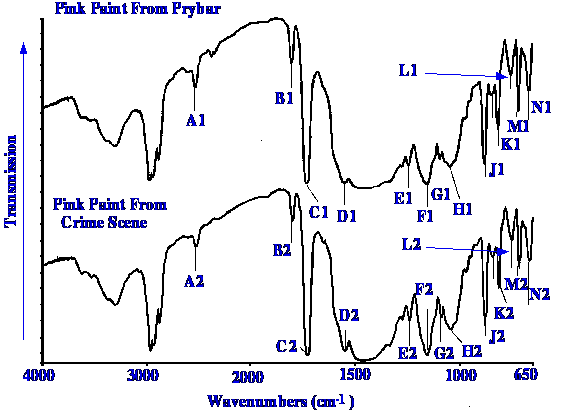 FT-IR was used to help solve a triple murder by comparing the paint found on the victim to the paint of the car, which was used to run him down. The paint chip was multilayered so a section had to be cut from both sample and reference to make the comparison. The results that were obtained are shown in figure 30.