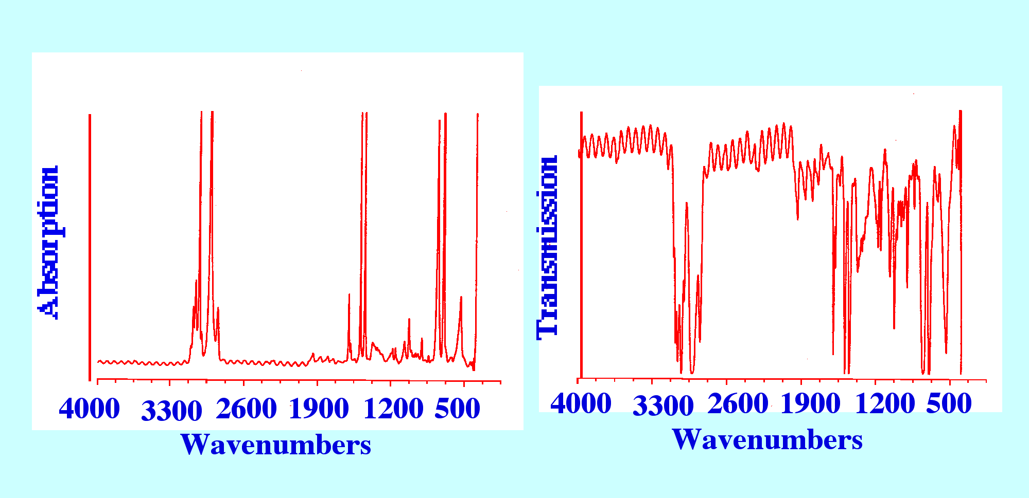 IR spectra can be presented as curves relating Transmission to, frequency, wavelength or wave numbers; alternatively the curves can relate Absorbance to the same variables. Transmission is obviously the complement of absorption and both methods of presentation are usually available on IR spectrometers. The Spectrum for polystyrene is shown both as a transmission curve and an absorption curve in figure 6.