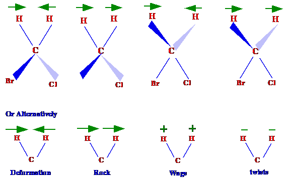 In addition, the stretching process can take place in a number of different ways. Consider now the vibrations possible from bromochloromethane. There are four possible ways the hydrogen -carbon bond can vibrate. These four possibilities are shown diagrammatically in figure 5 and are termed deformation, rock, wags and twists. The two common methods of depicting these processes are included in figure 5.