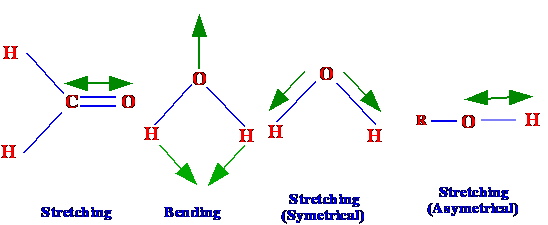 Consequently, a characteristic fundamental frequency and a specific absorption band will be associated with each vibration mode. Vibrations can be due to a change in bond length stretching or alternatively due to a change in the bond angle bending as shown in figure 4. Depending on the molecule (cf. water in figure 3), stretching vibrations can be symmetrical or asymmetrical.
