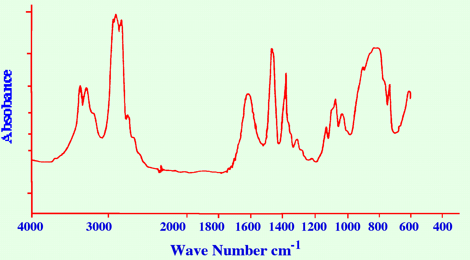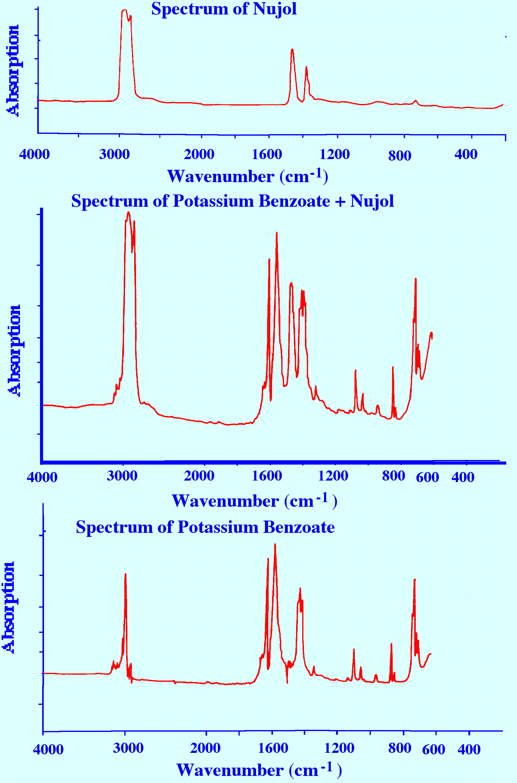 To prepare a mull, the sample is first ground to a fine powder in a pestle and mortar and then about 50 mg is suspended in about 20 μl of a mulling agent. The suspension is further ground into a smooth paste. One of the more common mulling agents is liquid paraffin sold under the name of Nujol . To obtain suitable spectra the proportions of sample to Nujol may need to be adjusted and the particle size of the sample must be sufficiently small. An example of a the Spectrum of potassium benzoate obtained by subtracting the Spectrum of Nujol from the Spectrum of potassium benzoate plus Nujol is shown in figure 13.