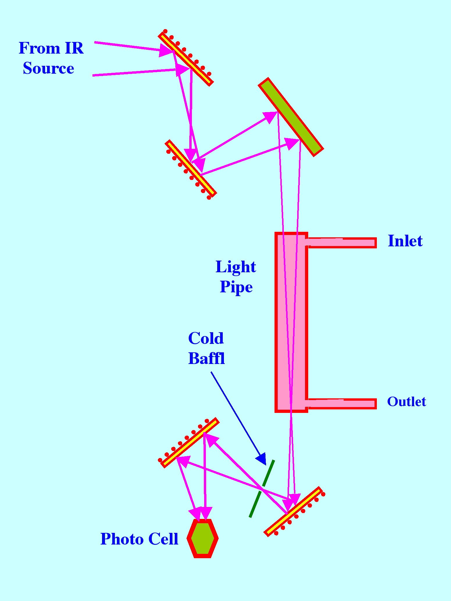 The light source is moved back, so that the focus, which normally coincides with the entrance of the light pipe, is transferred to the exit of the light pipe, but the process is not completely efficient. Internal reflections at the walls of the light pipe results in the 'apparent path length' being increased by about 33%. Many modern GC/IR systems employ Light Pipes to augment the IR signal.