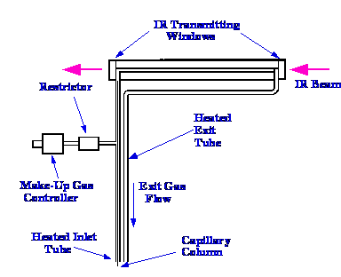 A diagram of a light pipe originally designed by the Perkin Elmer Corporation is shown in figure 16. The light pipe itself is 120 mm long, 1 mm I.D and coated internally with gold. The oven surrounding the light pipe, can be operated up to 350⁄C, and is carefully designed to eliminate any cold spots on the tube, which might allow solute condensation (the elimination of any possibility of sample condensation is extremely important). In normal use for gas sampling, the sample is passed into the inlet tube and out of the exit tube in the normal manner. When used as GC/IR interface the capillary column is led into the interface through a heated tube right up to the actual light pipe. Concentric to the column, and through the same heated tube is fed a stream of scavenging gas that carries the solute through the IR light pipe. This maintains the integrity of the separation at the expense of some solute dilution and consequent slight loss of sensitivity. If the solute bands were not swept out by the scavenging gas, the solute peaks from the column would accumulate in the IR light pipe, and as a consequence, several solutes would be detected and measured simultaneously, and resolution would be lost.