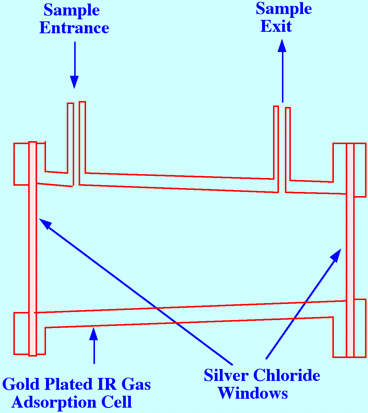 Gas samples are often of interest in pollution studies and spectra can be obtained from such samples by employing a gas sample cell similar to that shown in figure 14. The cell is gold plated and polished internally to reduce light loss and increase absorption of the infrared light. The windows were constructed from silver chloride (horn silver ) to provide mechanical strength and rigidity, and also to be relatively impervious to water vapour. This type of cell was used in the early gas chromatography and in IR spectroscopy tandem systems. Another type of gas cell that can provide very high sensitivity and, thus, spectra from very small amounts of sample is the light pipe. This device was originally designed to provide on line spectra from peaks eluted from a gas chromatography capillary column where the amount of solute eluted may be less than one microgram.