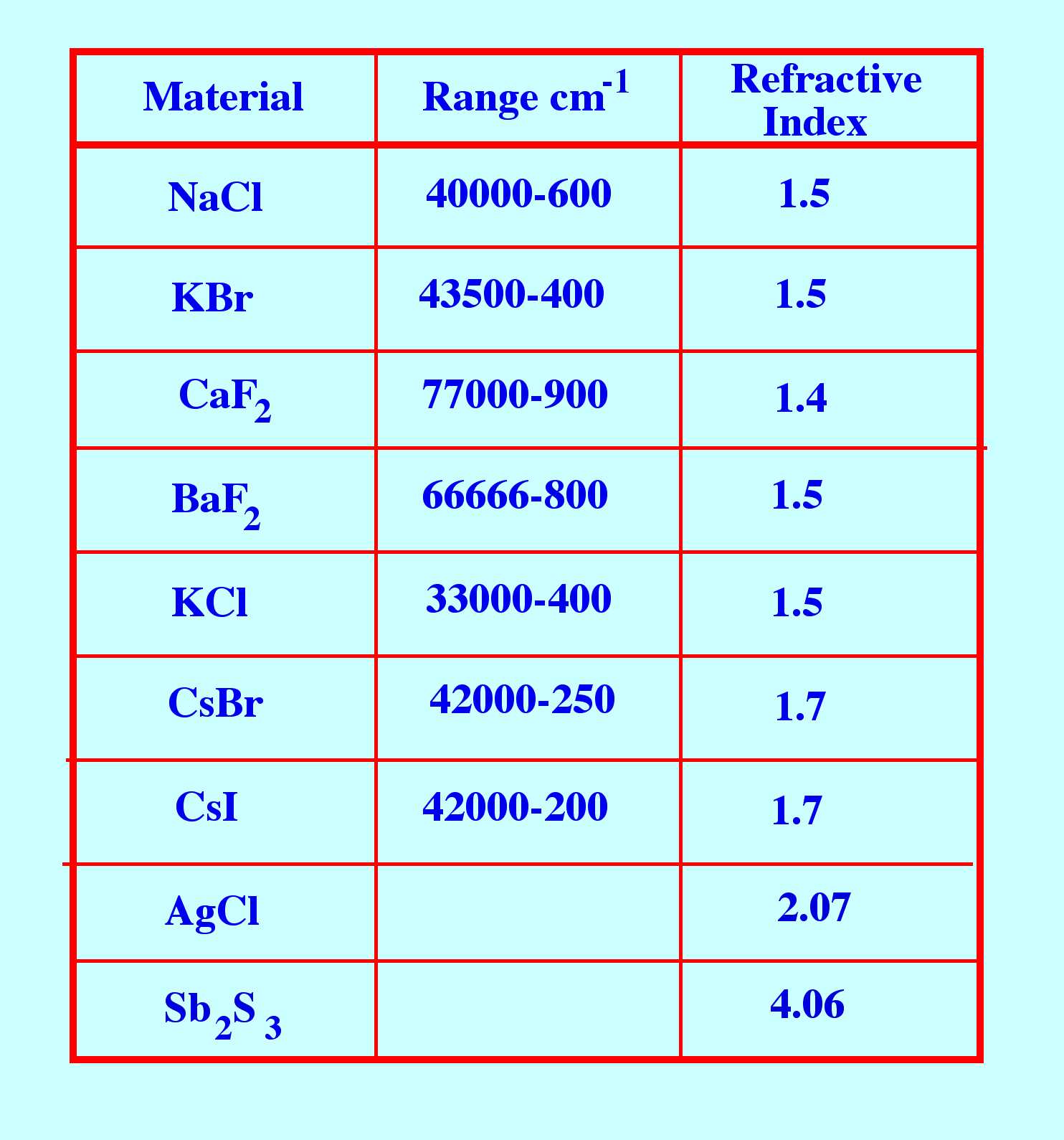 Irrespective of the procedure used for sampling, the device needs to be constructed of materials that are transparent to IR light of the appropriate wavelength range. A list of those substances that can be used as windows for infrared sample cells is given table 2.