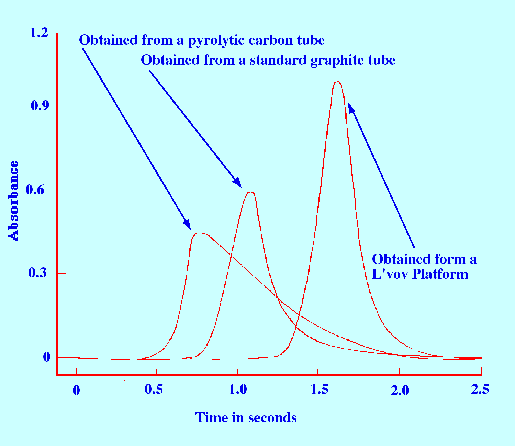 The poor uniformity of temperature can cause condensation or recombination of atoms. L’vov suggested that a small graphite platform coated with pyrolytic carbon was inserted in the furnace. A diagram of a furnace containing a L’vov Platform is shown in figure 19. The platform was heated by radiation from the hot walls and by the hot gas molecules; thus, the vaporization an Atomization was delayed until the tube had obtained constant temperature. The net result was that the sample was always vaporized into an environment that was hotter than the surface from which it left. As a consequence, the chance of condensation and recombination was significantly reduced and any molecular species that were rendered volatile were more likely to suffer dissociation. The L’vov Platform has shown a great improvement in performance, particularly sensitivity, and without surface modification. Matrix modification has shown even greater improvement in performance. The relative performance of a simple pyrolytic carbon tube, a standard graphite tube and a graphite tube containing a L’vov platform is shown in figure 20.