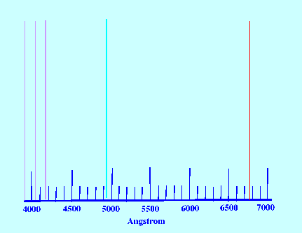 In the Spectrum shown in figure 22 the spectral lines are closely matched to the precise wavelengths given on the wavelength scale. However, in the spectra given in figures 24 and 25 the relationship between the lines and the scale are not so precise but are sufficiently accurate to give a correct impression of the forms of the spectral line distribution. It is clearly seen that there are considerably more lines in the Visible region spectra and this is because the extra electron in orbit round the nucleus adds many energy levels to the atom and, thus, many more emission lines are apparent.
