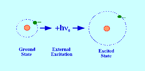 Atomic adsorption spectroscopy, as already stated, is the complement to Atomic Emission Spectroscopy where the light corresponding to that frequency associated with the emission from a particular element is passed through a hot gas or vapor containing that element. The light raises the energy of the valancy electron from the ground state to the excited state by absorbing some of the irradiating light. The process of light absorption is depicted diagrammatically in figure 10.