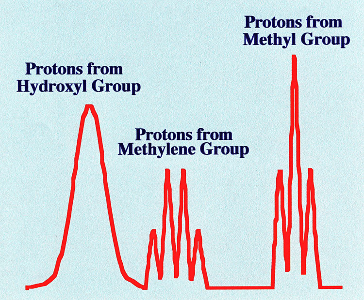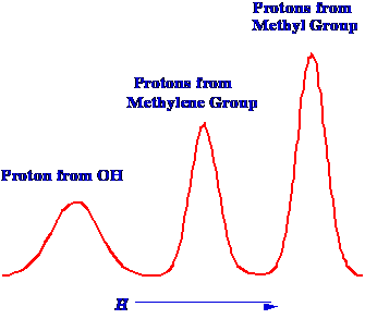 The Spectrum obtained for alcohol is shown in figure 4. The device has been examined on a low-resolution spectrometer. The sample has been irradiated with electromagnetic waves of the calculated frequency and the intensity of the magnetic field was then scanned over a narrow range close to that where the absorption of energy was expected to take place. The energy of absorption, which is sensed electronically, is shown plotted against field strength to provide the NMR Spectrum. There are several points of interest arising from the resulting simple Spectrum shown in figure 3. First, it can be shown that the three peaks have areas in the proportions of 1:2:3 which would indicate that they arise from the proton associated with the oxygen atom, the methylene protons and the methyl protons.