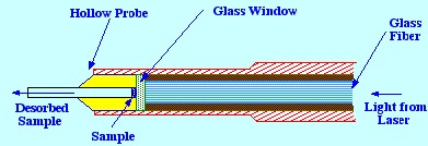 The laser light is focused by means of suitable lenses onto an optical fiber pipe, which passes though the probe and onto a glass window at the end of the probe. The sample is placed next to the glass window and the desorbed molecules pass along the hollow tube to be ionized by electron impact. This type of desorption causes very little thermal degradation, and has been used satisfactorily for measuring the spectra of labile materials, such as certain antibiotics.