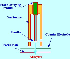 The process of field desorption involves the extraction of ions from a sample (deposited on a specially prepared surface) by the use of extremely high electrical fields. The preparation of the emitting surface is quite involved. A diagram of the field desorption source is shown in figure 17. The emitter is mounted on an insulated probe, which is introduced into the ion source by means of the standard vacuum lock. About 2 mm from the probe tip is a counter electrode, which is held at a potential of about 10,000 V relative to the probe. The ions produced from the emitter are accelerated toward the counter electrode, pass through a hole into the focusing section, and then into the mass spectrometer analyzer. The preparation of the emitter surface is both tedious and time consuming. The most commonly used surface consists of carbon micro needles that are formed on tungsten wire in a vacuum. One substance that is used for this purpose is benzonitrile . The material is placed on the wire and the temperature adjusted to gently pyrolyse the material, producing carbon spots along the wire.