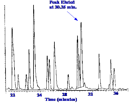 The mass spectrometer employed was the Hewlett-Packard MS Engine Quadrupole Mass Spectrometer. The mass Spectrum of the peak eluted at 30.35 minutes is shown in figure 25.