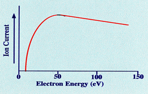 The optimum ionization energy of the electron varies with different compounds, but an average value appears to lie between 50 and 100 eV. The approximate relationship between ion current and electron energy takes the form shown in figure 4. The ionizing energy of the electrons is controlled by the accelerating potential applied to the anode in the ion source. This facility is important, as it allows the energy of the electrons to be adjusted so that optimum fragmentation will take place.