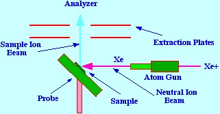 Fast atom bombardment spectrometry can be considered to be an extension of secondary ion mass spectrometry, and the design of the ionizer is shown in figure 10. A beam of high-energy particles is generated and focused onto the sample, which is held as a thin film on a clean metal surface. The secondary ions are extracted by an appropriate ion optical arrangement into the mass spectrometer analyzer. The impact of a high-energy ion striking the surface produces an intense thermal spike. The energy from this thermal spike is dissipated through the outer layers of the sample. In this innovative device first developed by Barber, neutral atoms of argon and Xenon were employed, but ultimately these were replaced by charged ions such as Ce+ and Xe+.
